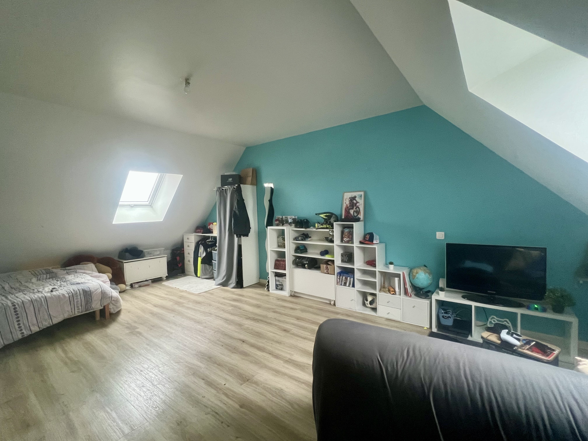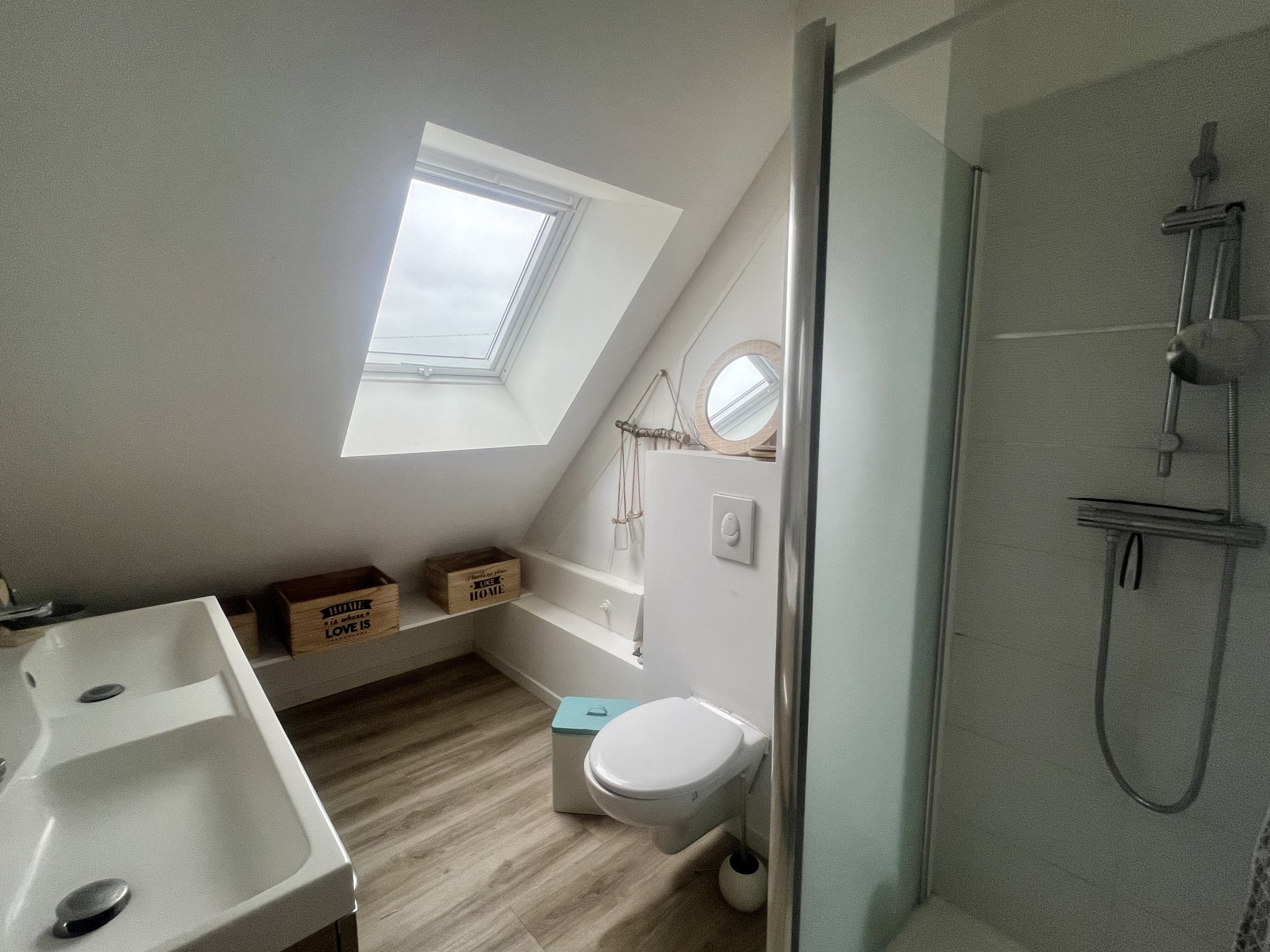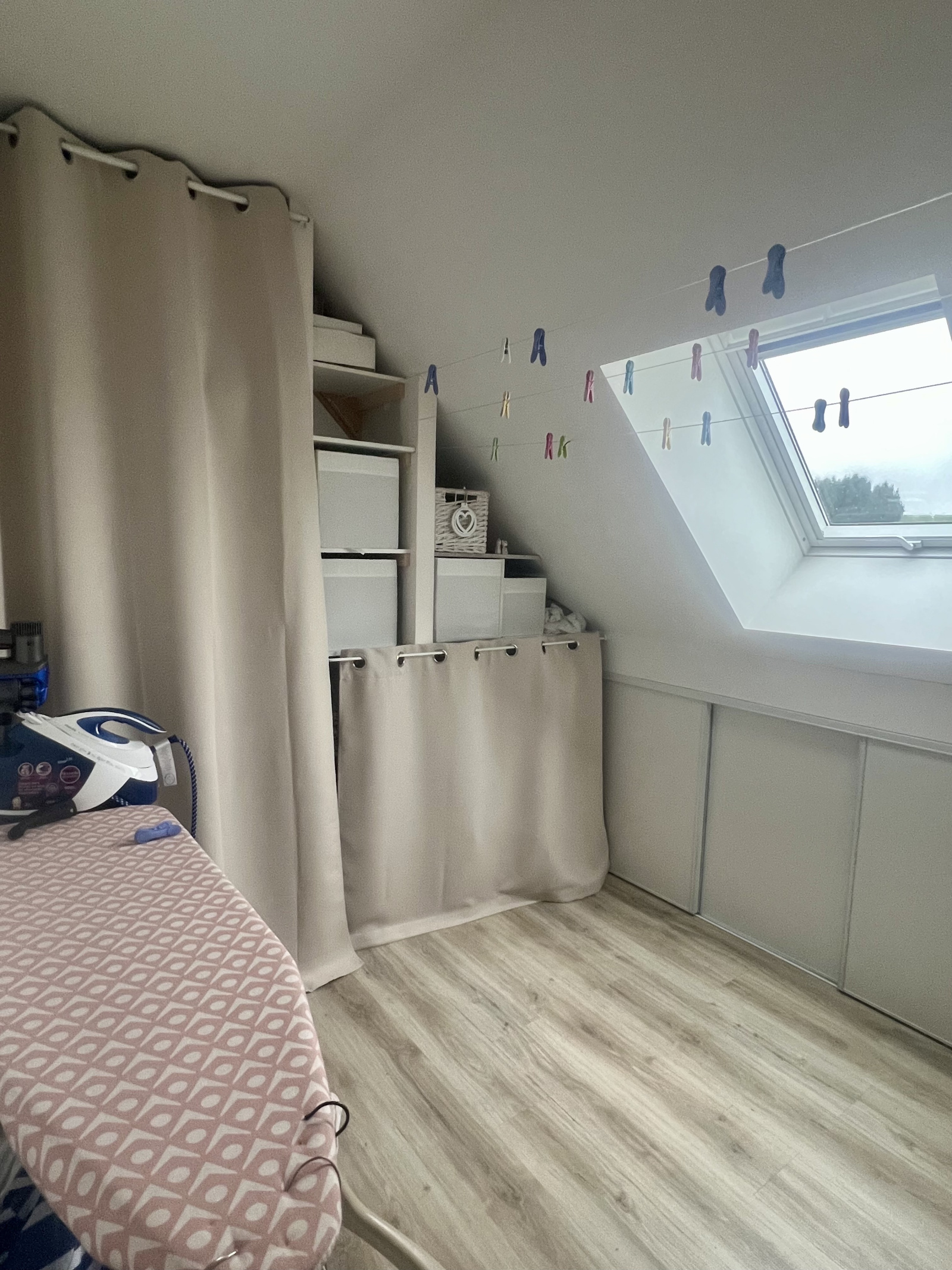 À l’étage, vous trouverez deux grandes chambres sous pente, une salle d’eau avec WC et une pièce dédiée au dressing, offrant un espace nuit confortable et bien agencé.